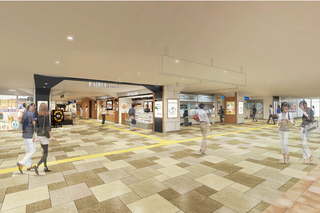 バスセンター内店舗を増床し、飲食コーナーの更なる充実を図ります。また、ファサードの仕様を揃え、店舗東側の壁をガラス面に変更し店舗入口を設けることで、東口広場側を明るくし店舗の魅力向上を図ります。