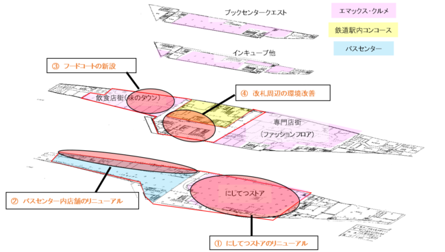 一方、天神大牟田線では、大規模地震への安全対策として2006年より耐震補強工事を行っております。西鉄久留米駅については2019年より耐震補強工事を行っておりますが、この度、”行き交う人がちょっと一息つける、街の中のオアシス空間”をコンセプトに商業施設をリニューアルすることで安全・安心な駅づくりを行うとともに、駅やバスセンターの利便性を向上させ、更なる街の活性化や賑わい創出に貢献いたします。
