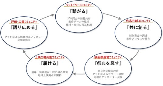 自発的なコンテンツ制作のチーム作り、制作資金のクラウドファンディング、作品制作プロセスや映画祭運営へのファンの参 画、上映の場や作品の評価・プロモーションへのファンや支援者との共創など、様々なコミュニティを構築して相互に連携さ せることで、作品が生まれて公開され世の中に広がっていくまでの一連の流れを加速させることを目指します。