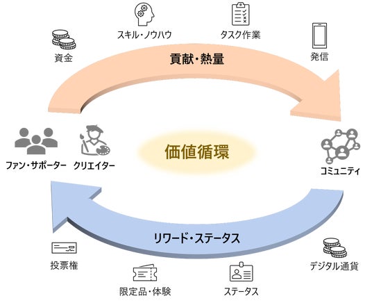 クリエイター間の連携の場を作ることで創作活動を活性化させ、従来の「コンテンツを制作する側/消費する側」という枠組みを 超えたクリエイターとファンの共創関係を構築するなど、新たなコミュニティモデルへと進化させていくことがねらいです。DCJPY の導 入により、資金調達・活用の透明化、クリエイターへの適切なロイヤリティ還元、適切なリワード設計によるコミュニティ駆動モデルを実現します。
