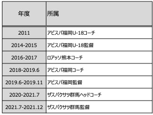 アビスパ福岡U-18コーチ - アビスパ福岡U-18監督 - ロアッソ熊本コーチ - アビスパ福岡コーチ - アビスパ福岡監督 - ザスパクサツ群馬ヘッドコーチ - ザスパクサツ群馬監督