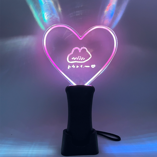 UP-Tから、ハート型のペンライトが新登場。パネル部分はクリアで、15色に光ります。ベーシックなスティック型のペンライトより印刷範囲が広く、文字やイラスト、写真を入れやすいのが魅力です。台座付きなので、アクリルスタンドとしてお部屋に飾ることもできます。