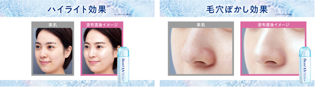 さらに、配合されている水光パールが均一に密着し、頬・鼻筋・ひたいにつやが生まれるハイライト効果*2により、肌が自然に明るく見え、顔全体の印象までぱっと明るくなります。また、肌の微細な凹凸や気になる小鼻の毛穴に、ソフトフォーカス成分が行き渡り毛穴をぼかします。