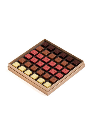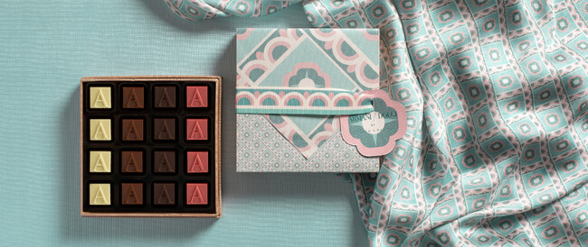 特別にデザインされた限定パッケージは、アラブの幾何学模様のような、花を思わせる柔らかな色合いの美しさが際立ちます。また、同じく幾何学的モチーフがプリントされたグログランリボンと、ジオメトリックな花の形をしたパーソナライズタグがアクセントになっています。16個、36個、64個入りのボックスからお選びいただけます。