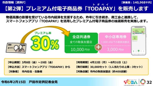 埼玉県戸田市は、物価高騰の影響を受けている市内経済を支援するため、昨年に引き続き、商工会と連携してスマートフォンアプリ「TODAPAY」を活用したプレミアム付電子商品券を抽選販売します。