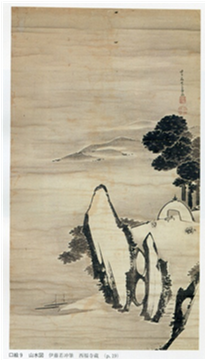 「伊藤若冲筆山水図」は、動植物の画題を得意とする若冲にとって希少な作例で、確認されているものは本図も含め数点程度です。また、一般的な山水図とは異なり、山門や僧など宗教的な内容が描かれる点も注目されます。