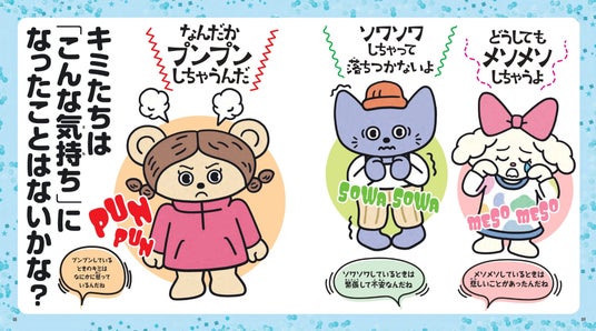 本書には、「プンプン ソワソワ メソメソともお友達になれるよ。そうしたら、もっと自由に自分のやりたいこと、やらないといけないことができるようになるよ」という想いを込めています。ぞう男くん、いぬ子さん、クマ美さん、ネコくんに自分を重ね合わせることで、「まさに自分にもこういうことがある」と思いながら、ネガティブな感情と友達になる方法をワクワクしながら学んでいくことができます。ネガティブな感情に蓋をするのではなく、その機能や役割を理解することで親近感を持つことが、感情と仲良くなる一歩に繋がります。子どもが自分でも試してみたくなる「気持ちの受け止め方」や「付き合い方」もたくさん紹介しているので、ぜひ、多くの子どもたちのお気に入りの1冊になればと願っています。
