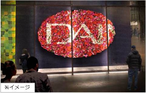 咲いている時と閉じている時で色の異なる造花を無数に敷き詰め、花の開閉をコントロールして文字や図柄を表現する、いわば花の電光掲示板、「フラワーミラー」。プレミアムフライデーのスタートを記念して、午後3時の直前に「3・2・1」の文字を表示させカウントダウン!