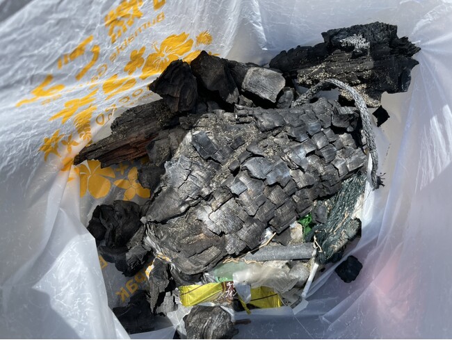 お盆シーズン後ということもあり飲料水やお菓子などのごみや炭などが捨てられていました。