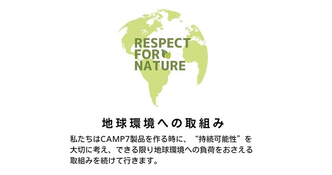 社会環境や自然環境の大きな変化を感じる日々の生活の中で、自然の大切さを感じてほしい、環境に配慮した衣類を身に着けてほしい、より良い未来をつくりたい、という思いから、“CAMP7” では “持続可能な地球環境” を第一に考え、環境負荷低減に向けた取組みを積極的に行っています。