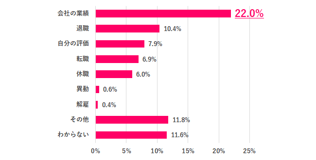 金額差があった人にその要因を尋ねると、最も多かったのは「会社の業績」(22.0%)でした。2021年夏のボーナスの調査と同様に、フリーコメントには「新型コロナの影響」と回答する人も見られました。「その他」「わからない」の回答を除くと、2位は「退職」(10.4%)、次いで「自分の評価」(7.9%)という結果でした。