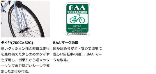 また、クッション性の高いスポーツサドルや、荒れた路面でも走行できる700×32Cの太めのタイヤ、7段変速、サイドスタンド、フロントライトを装備。街乗りでも扱いやすく、週末のツーリングも楽しめる、幅広いシーンに対応したカジュアルロードです。