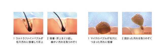 ウルトラファインバブルは毛穴の奥まで入り込んで汚れを取りのぞき、マイクロバブルが毛穴につまった大きな汚れを浮かせて取りのぞきます。