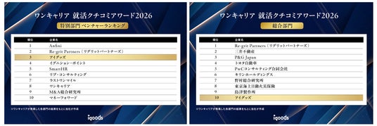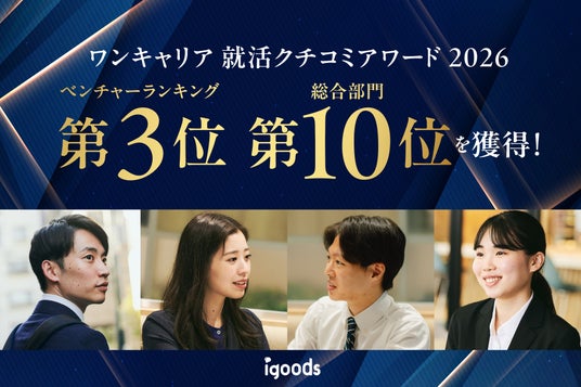 オリジナルグッズを企画製造するアイグッズ株式会社(本社:東京都渋谷区)は、2026年3月、株式会社ワンキャリアが発表した「ワンキャリア 就活クチコミアワード2026」にて、ベンチャー部門第3位、総合部門第10位を受賞しました。