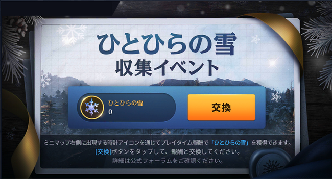 イベント期間中、イベント専用のプレイタイム報酬を獲得することができ、獲得した「ひとひらの雪」はイベントページの「交換」ボタンからお好きなアイテムと交換することができます。詳細は以下URLをご確認ください。