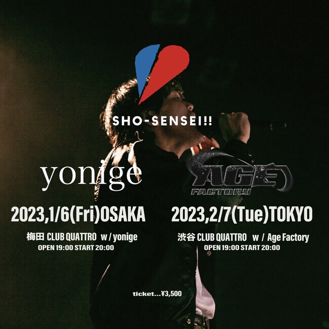 今回のツアーは、SHO-SENSEI!!自身の憧れるアーティストを呼んでの対バン形式のライブ。大阪公演では“yonige”、東京公演では “Age Factory”の出演が決定した。チケットは、本日11月11日(金)12:00よりイープラスにてプレオーダー受付を開始する。