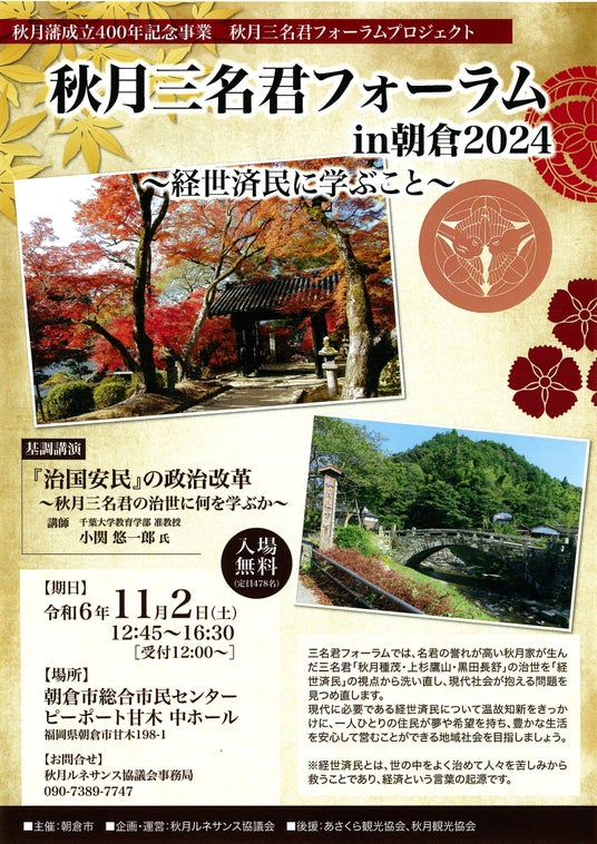 朝倉市では令和5年から6年にかけて秋月藩成立400年記念事業を行っています。