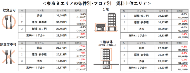 東京9エリアにおける2022年度下期の50坪以下の貸店舗の募集賃料(以下「賃料」)は、