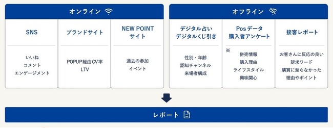 NEWPOINTは、各顧客接点で取得した「定性」と「定量」のデータをまとめて出店ブランドにレポートとして還元し、顧客を解像度高く理解することに貢献します。またNEW POINTも、本イベントでの出店ブランド・来場者のNEWPOINT自体へのサービス評価をもとに改善を行います。