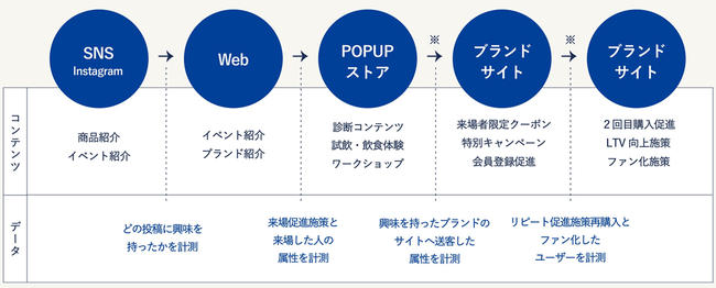 出店による売上や認知拡大にとどまらず、NEW POINTのWEBサイト、SNS、イベント会場、出店ブランドのECサイト等の各顧客接点のデータを連携させ、顧客との関係構築と継続的な効果測定を可能にしていることが特徴です。