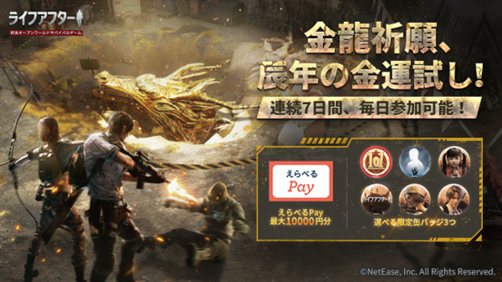 新春はライフアフターで辰年の金運を試してみませんか?2月2日(金)から連続7日間、公式Xカウントで毎日参加できるフォロー&RT抽選キャンペーンを開催します。イベント参加で最大10000円分のえらべるPayや限定グッズが獲得できます!
