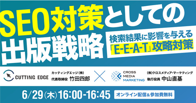 株式会社クロスメディア・マーケティング(本社:東京都渋谷区、代表取締役 美濃部哲也、以下クロスメディア・マーケティング)は、経営者、企業の経営企画室責任者、PR担当者、広報担当者向けに、SEO検索対策としての出版戦略セミナーを、2023年6月29日(木)16:00よりオンラインにて開催いたします。