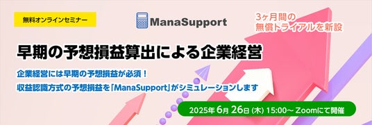 株式会社ニーズウェル(本社:東京都千代田区、代表取締役会長兼社長 船津浩三)は、2025年6月26日(木)15時より、無料オンラインセミナー「早期の予想損益算出による企業経営 ~企業経営には早期の予想損益が必須! 収益認識方式の予想損益を「ManaSupport」がシミュレーションします~」を開催します。