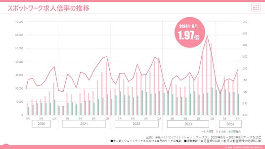 1.スポットワークの求人倍率は1.97倍。前年より求人数+46.1%、求職者数+20.2%の伸び。