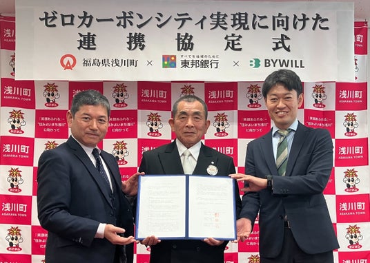 日本全国47都道府県のカーボンニュートラル実現を目指す株式会社バイウィル(本社:東京都中央区、代表取締役社長:下村 雄一郎、以下「バイウィル」)は、福島県浅川町(町長:江田 文男、以下「浅川町」)、株式会社東邦銀行(本店:福島県福島市、取締役頭取:佐藤 稔、以下「東邦銀行」)と、「ゼロカーボンシティ実現に向けた連携協定」を締結しました。