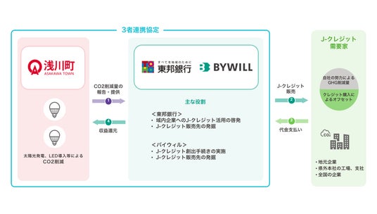 バイウィルは、浅川町におけるJ-クレジット創出プロジェクトの登録・申請からモニタリング、創出したクレジットの販売までをシームレスに支援します。また、販売に関しては、東邦銀行とも協力し、「地産地消」によって浅川町をはじめとする地域の脱炭素化を促進します。
