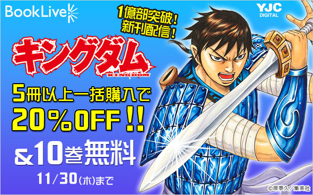 このたびブックライブにて、『キングダム』の電子版含む累計発行部数が、本日発売となる70巻で1億部を突破したことを記念した『キングダム』10巻の期間限定無料配信キャンペーンを実施するほか、さらなる飛躍への応援の気持ちを込めて、ブックライブ特別キャンペーンとして、5冊以上のまとめ買いで20%OFFでご購入いただけるクーポンを配布いたします。