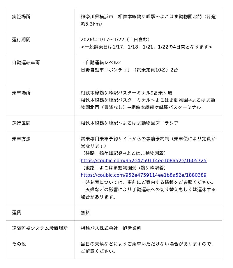NTTドコモビジネス株式会社(旧 NTTコミュニケーションズ株式会社、以下 NTTドコモビジネス)を代表機関としたコンソーシアム8社※1 、2つの協力機関※2 、および横浜市は、自動運転バスの走行に関する実証実験(以下 本実証)を2026年1月17日から1月22日まで実施します。本実証では、都市部で深刻化するバス運転者不足や休日の交通混雑・渋滞、また狭あい道路や見通不良箇所での対向車両同士が安全にすれ違うための走行調整(離合制御)などの課題に対し、通信制御技術と路車協調技術※3 を組み合わせた新たな自動運転モデルの構築を目的としています。