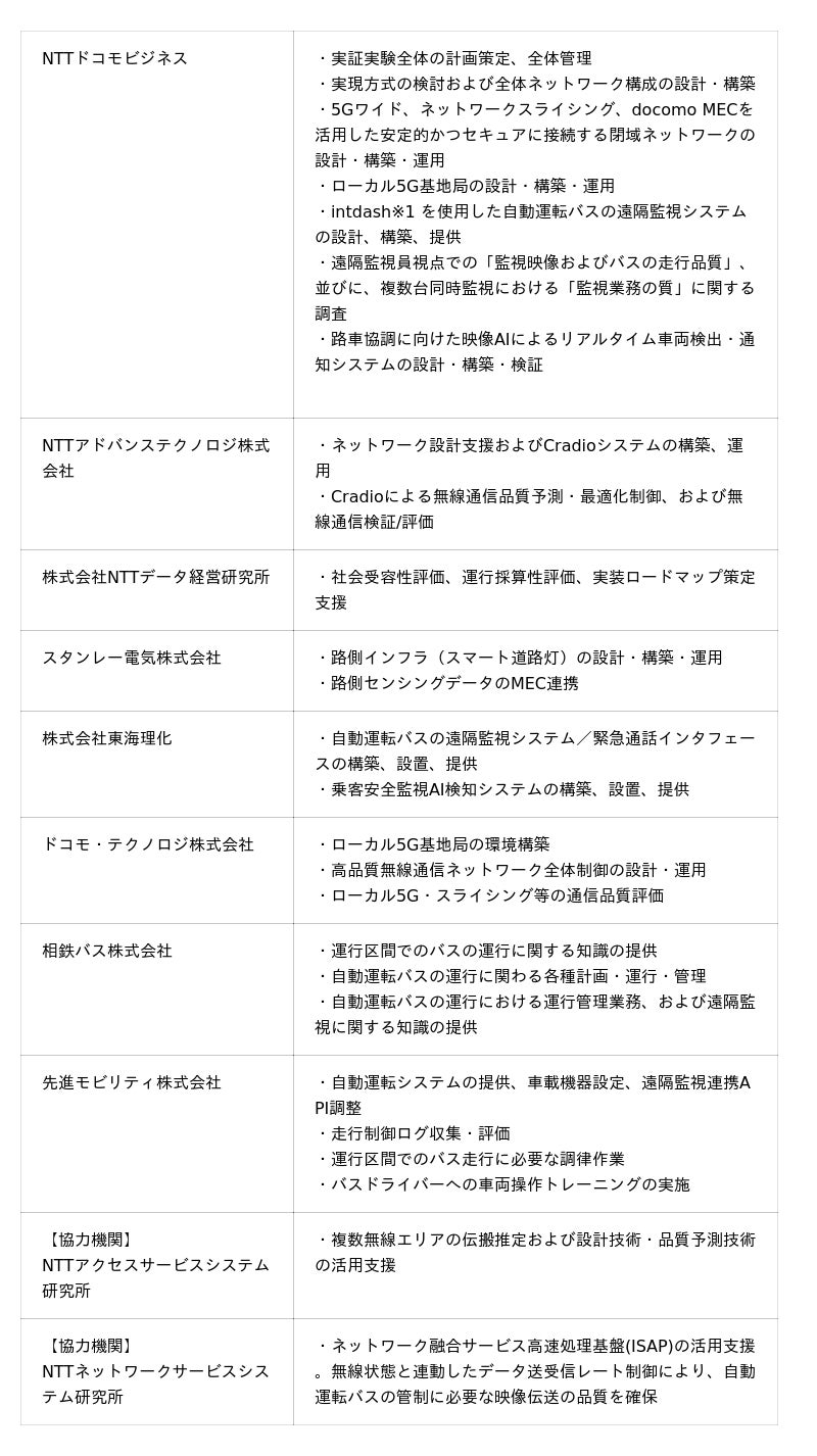 本実証実験は、総務省の令和6年度補正予算「地域社会DX推進パッケージ事業(自動運転レベル4検証タイプ)」に採択された、NTTドコモビジネス株式会社を代表機関とした8社で構成されるコンソーシアム、および2つの協力機関で実施します。本実証での各社の役割と使用する技術要素・構成は以下の通りです。