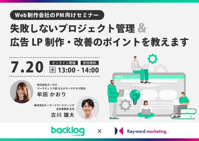 株式会社ヌーラボ(本社:福岡県福岡市、代表取締役:橋本正徳、以下 ヌーラボ)は、株式会社 キーワードマーケティング(本社:東京都中央区、代表取締役:滝井 秀典、以下 キーワードマーケティング)と共催で、「Web制作会社のPM向けセミナー 失敗しないプロジェクト管理&広告LP制作・改善のポイントを教えます」を2023年7月20日(木)に開催いたします。
