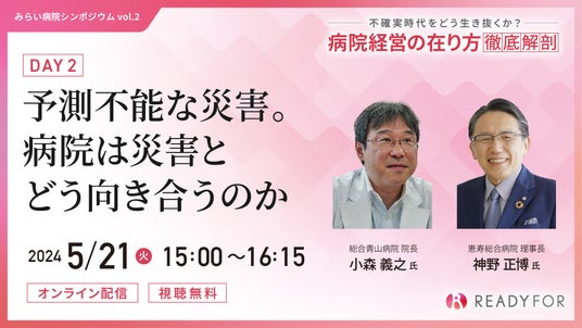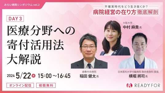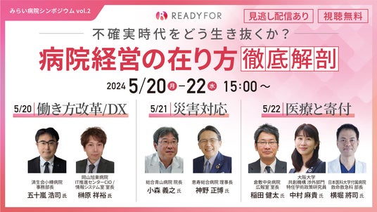 日本初・国内最大級のクラウドファンディングサービス「READYFOR」を運営するREADYFOR株式会社は、2024年5月20日(月)~22日(水)にみらい病院シンポジウムvol.2「不確実時代をどう生き抜くか?病院経営の在り方、徹底解剖」を開催いたします。