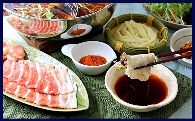 ラー油の辛味とごま油のコクを効かせた、これからの季節にピッタリな『ラー油つけだれ』は、食べると絶対くせになるやみつきだれ!沢山のお野菜と三元豚バラ肉・三元豚肩ロース肉がすべて食べ放題で味わえる『しゃぶしゃぶ』のたれとしてはもちろん、のど越しの良い風味豊かな『生そば』や『うどん』などにも最適!
