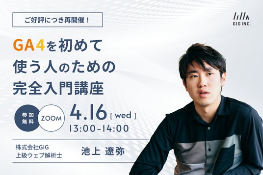 株式会社GIGは、GA4を初めて使う人向けの指標の意味や機能、活用方法を解説するウェビナーを4/16(水)に再開催します。参加費無料、事前登録制。