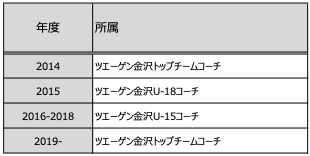 ツエーゲン金沢トップチームコーチ - ツエーゲン金沢U-18コーチ - ツエーゲン金沢U-15コーチ - ツエーゲン金沢トップチームコーチ