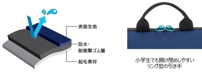 耐水性・耐衝撃性の高い生地と止水ファスナーを採用しているので、ランドセルの中でも揺れなどの衝撃に強く、浸水からもPC・タブレットを守ります。また、外側はポケット等のないフラットな形状にし、ランドセルからの出し入れがしやすい設計となっています。さらに、開口部が大きく開き、端末が入れやすいL字型ファスナーと、小学生でも開け閉めしやすいリング型の引き手を採用しています。