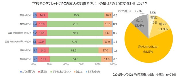 一方、 GIGAスクール構想と並行して進められている学習指導要領の改訂によって、学習内容が増加。効率的な授業を行うため、プリントを活用した学習も多く見られます。中高生を対象にしたコクヨの調査(2021年6月/n=756) によると、タブレットやPC導入の影響によるプリント量の変化は、87%が、「どちらともいえない」「(とても)増えた」との回答となっています。 学生の学習アイテムは、教科書やノート、参考書、今まで通りのプリント量に加え、新たにPCやタブレットが増えることで、机上のスペースが狭くなったり、通学時の持ち運びのアイテムが増え、身体的な負担への不安の声も挙がっています。
