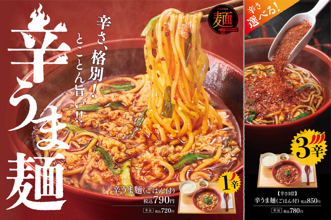 株式会社プレナスは、定食レストラン「やよい軒」を、2023年2月末現在364店舗展開しております。このたび「やよい軒」では、モチモチな麺と旨味たっぷりの辛味スープが相性抜群の宮崎名物の辛麺をやよい軒風にアレンジした『辛うま麺(ごはん付)』790円、『辛うま麺(単品)』720円を発売いたします。また、より辛さを求める方向けに『【辛さ3倍】辛うま麺(ごはん付)』850円、『【辛さ3倍】辛うま麺(単品)』780円も発売いたします。やよい軒風にアレンジした“辛麺”をぜひお楽しみください。