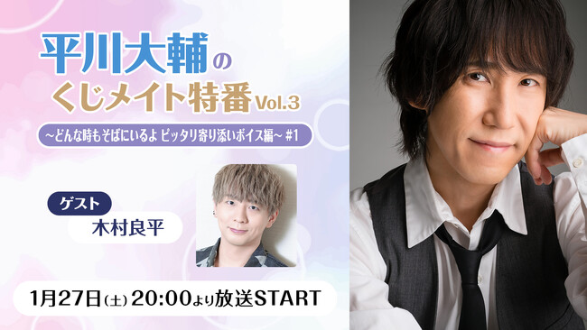 ニコニコ生放送で1月27日(土)20時より配信する本サービスの発売を記念した特別番組「平川大輔のくじメイト特番Vol.3~どんな時もそばにいるよ ピッタリ寄り添いボイス編~#1」では、平川本人が「くじメイト」を紹介したり、サンプルボイスを収録したりするほか、ゲストの木村良平とともにここでしか見られない貴重なトークやバラエティ企画など、視聴者の期待に応える盛りだくさんの内容でお届けします。