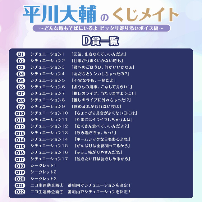 D賞の「どんな時もそばにいるよ ピッタリ寄り添いボイス編~」は、シークレット3種類を含めた全22種類のオリジナルボイスです。C賞とは異なる内容で、日々の生活の中で散り積もっていく不安や不満が起こるさまざまなシチュエーションに、平川のボイスが優しく寄り添い、まるで平川がいつもそばで見守ってくれているような不思議な感覚を味わえるボイスが含まれています。