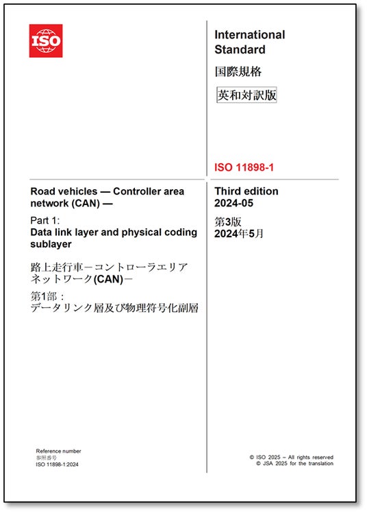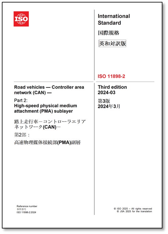 一般財団法人日本規格協会(本部:東京都港区、理事長:朝日弘)は、2025年4月1日(火)にISO 11898-2:2024「路上走行車-コントローラエリアネットワーク(CAN)-第2部:高速物理媒体接続部(PMA) 副層」の邦訳(英・日対訳版)を発行いたしました。