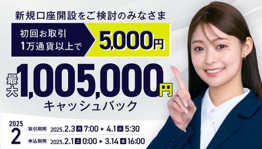 2月に新しく口座開設いただいたお客さまを対象に、初回お取引1万通貨以上でもれなく5,000円をキャッシュバック、さらに期間中のお取引数量に応じて、最大100万円をキャッシュバックいたします。