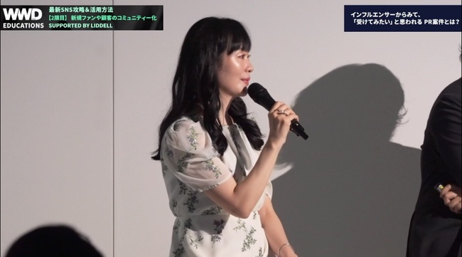 mimi@美容愛好家(ベビーオイル洗顔の人)は、「インフルエンサーのSNSアカウントや投稿内容に目を向けがちだが、その向こうにいるのは人」と話しました。「なぜ依頼したいのか、投稿を見た感想、自社の商品への思いなどを綴った手紙とともに、PR投稿を依頼してくださる企業担当者もいる」と紹介し、「PR投稿への感想やフィードバックをもらいつつ、継続したお付き合いの中で関係が築かれていく」と、パートナー化するまでの経緯を具体事例とともに解説しました。