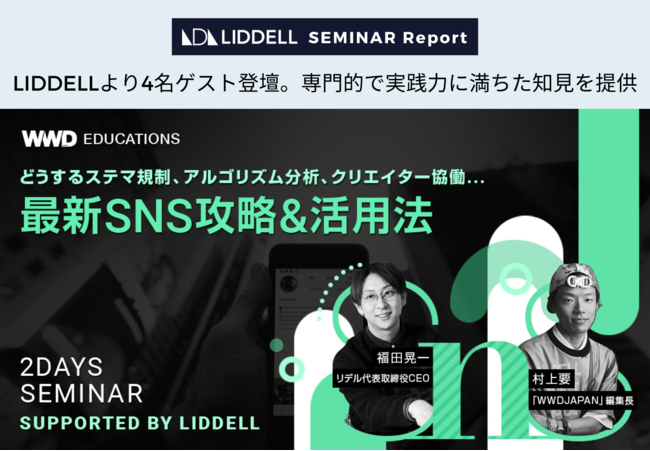 SNS・インフルエンサーマーケティング事業を展開するLIDDELL株式会社 (本社:東京都港区、代表取締役:福田 晃一、以下リデル) の代表福田他、3名は、2022年8月26日(金)、9月2日(金)に開催された『「WWDJAPAN Educations」ステマ規制やアルゴリズム分析、クリエイター協働など 最新SNS攻略&活用法を網羅する2DAYSセミナーを開講Supported by LIDDELL』にゲスト登壇しました。
