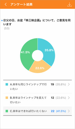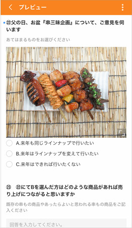 まつおか では、惣菜や弁当の新商品を毎シーズン10品ほどリリースする中で、商品の売れ行きやお客様の反応といった情報を店長から集めるため、スマートフォンで簡単に回答できる「アンケート」機能を使用。Excelで作成した質問をメールに添付して送っていた頃よりも回答率が向上しました。また、手作業での集計作業も不要になり、自動作成されたグラフを報告会議などでそのまま使うことができるため、資料を作成する工数も削減でき