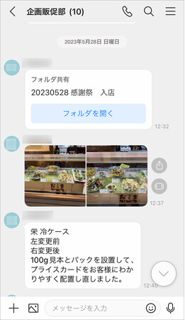 左:販促部門は他店舗にとって参考になりそうな事例をピックアップし、写真や保存先のフォルダをトークで共有。