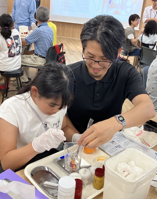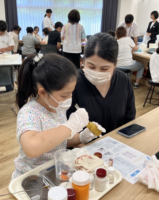 研修センターにある実験室を模した「実験ラボ」で、流し込みの口紅を作るのが今回のメインイベント。原料となるベース材料と色顔料やパール顔料などを正しく秤量して混ぜ合わせ、湯煎で溶かして型に流し込む工程は、小学生にとっては少し難しい内容でしたが、保護者やボランティアの高校生がしっかりサポート。親子や地域のコミュニケーションにもつながりました。完成した口紅は、肌につけて色を確かめて楽しむこともできました。研究所で使用するものと同じ実験道具を使用した口紅づくり実験は、真剣そのもの。ものづくりの楽しさだけでなく、大変さにも気づくことができたのではないかと考えます。当社は、今後も子どもたちの成長につながる取り組みを実施していきたいと考えます。